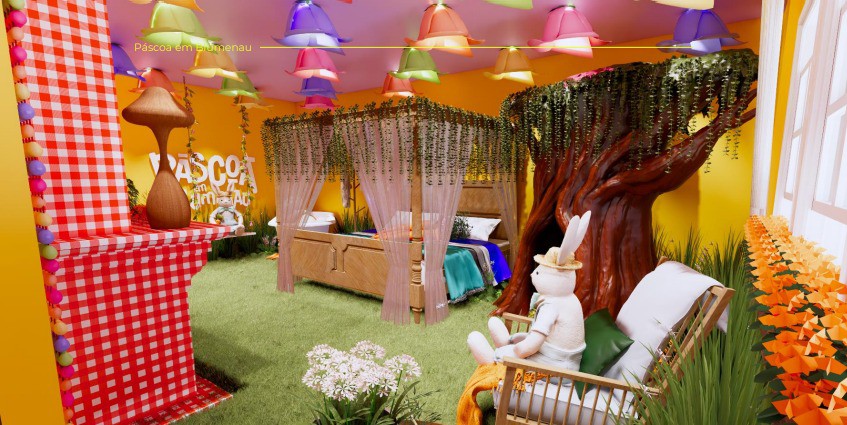 A cenografia da páscoa conta com um ambiente lúdico, sensorial e afetivo, que convida o público a vivenciar uma experiência imersiva em um universo encantado. Entre árvores, flores e o aroma característico da natureza, surge um pequeno mercado mágico onde os coelhos se encontram para trocar ovos coloridos, flores, cenouras e chocolates artesanais, unindo o charme simples do campo ao acolhimento das tradicionais feirinhas do interior. Outro destaque é a Casa do Coelho, uma das atrações mais aguardadas, um ambiente completamente imersivo e decorado para encantar o público que espera pelo tão famoso Coelhinho da Páscoa.